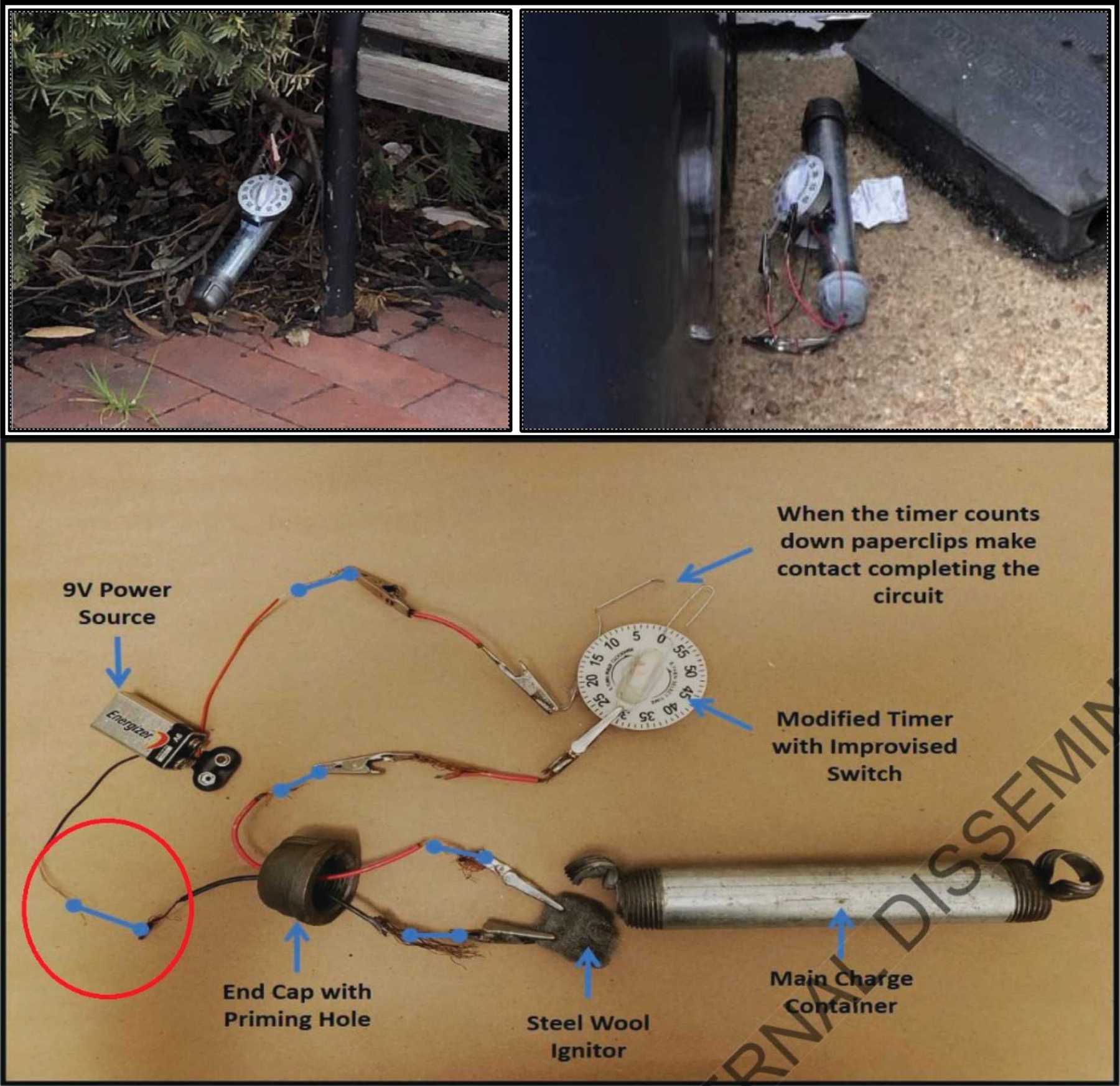 “Beyond the lack of a viable explosive filler for the two pipes, neither device has a functional fuzing and firing system capable of igniting a flame-sensitive explosive filler,” he wrote. “Based on my experience and testing, a single 9-volt battery attached to a 1.5-inch square of steel wool will not generate enough heat to ignite Black Powder.”