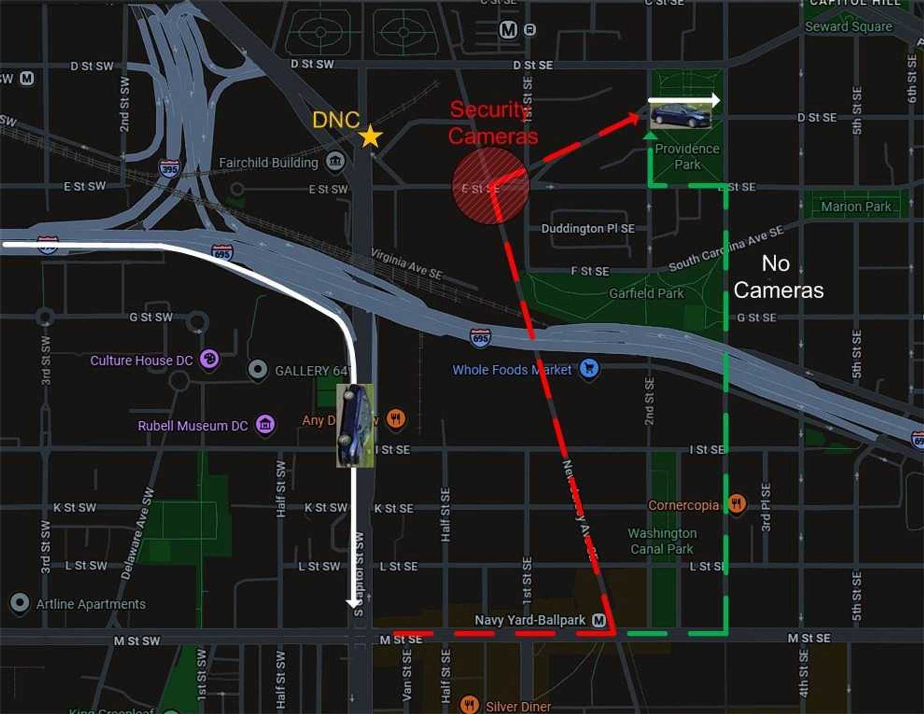 Since Cole’s vehicle does not appear on any public video driving from I-395 to Folger Park, that likely means he would have passed up the most direct route and taken a longer, more circuitous path. The less direct route (see map) avoided Capitol Police cameras, possibly suggesting Cole would have had knowledge of the camera locations.